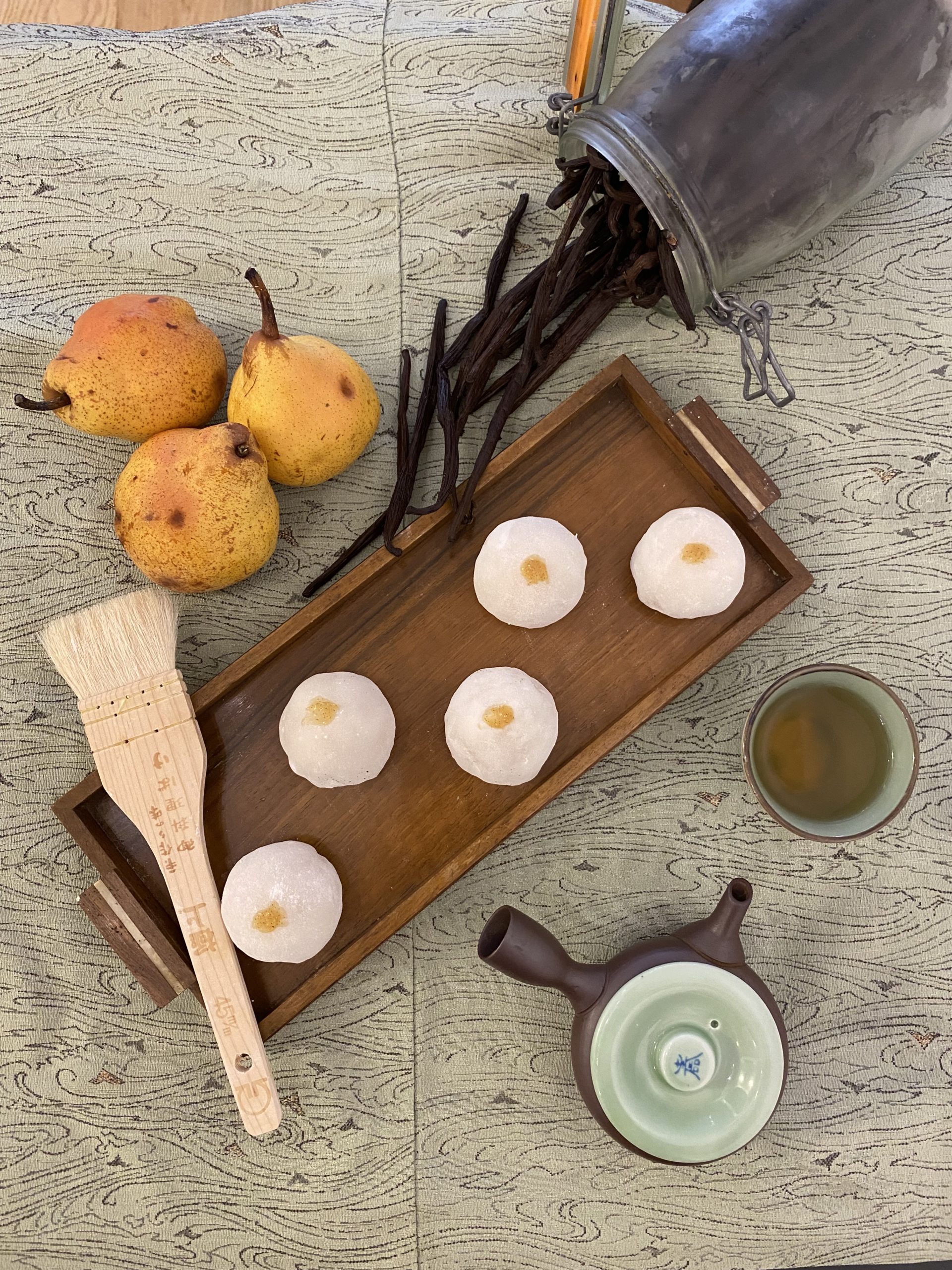 Nous utilisons des POIRES bio compotées avec une touche de miso à la vanille, enrobé de pâte de haricot blanc au miso et à la vanille, le tout recouvert d’une pâte de riz gluant moelleuse cuite à la vapeur